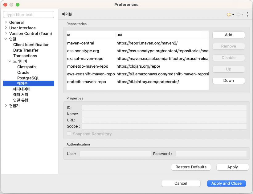 사설 Nexus 설정을 통해서 DBeaver의 DataBase Driver를 다운로드 받을 수 있음